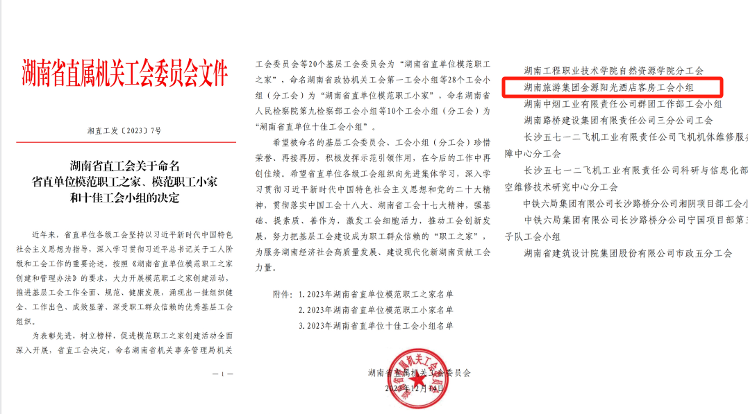 近日,湖南省直機(jī)關(guān)工委公布了《關(guān)于命名省直單位模范職工之家、模范職工小家和十佳工會小組的決定》,湖南旅游集團(tuán)金源陽光酒店客房工會小組在眾多參評單位中
