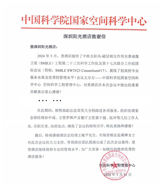 會(huì)議結(jié)束后,全國人大代表、中國科學(xué)院國家空間科學(xué)中心主任王赤院士對酒店提供的優(yōu)質(zhì)服務(wù)給予了高度評價(jià),中國科學(xué)院也特意向酒店團(tuán)隊(duì)發(fā)來感謝信,對酒店團(tuán)隊(duì)在會(huì)前、會(huì)中、會(huì)后所展現(xiàn)出的專業(yè)素養(yǎng)和高效服務(wù)表示由衷感謝。