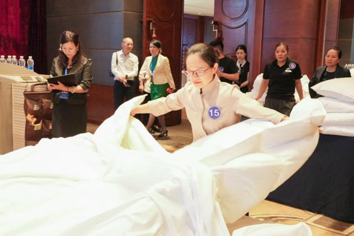 競賽現(xiàn)場,氣氛熱烈而緊張,項目設(shè)置全面而精細,從前廳接待到客房服務(wù),再到中餐、西餐的細致呈現(xiàn),全方位展現(xiàn)了星級飯店服務(wù)的精湛技藝。這不僅僅是一場技藝的巔峰對決,更是對深圳旅游服務(wù)品質(zhì)的一次全面檢閱與提升。