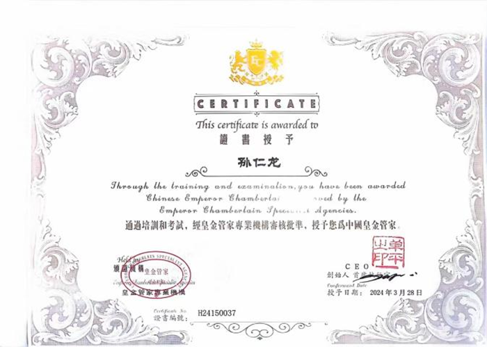 ▲孫仁龍“中國(guó)黃金管家”資格證書