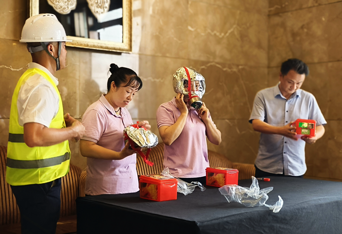 演練結(jié)束后,現(xiàn)場(chǎng)組織消防器材使用培訓(xùn),通過抽查酒店各部門員工對(duì)防煙面具、滅火毯及滅火器的操作熟練度,并結(jié)合實(shí)操演示和講解使用技巧,進(jìn)一步鞏固“報(bào)警、滅火、疏散、自救”四項(xiàng)核心技能。